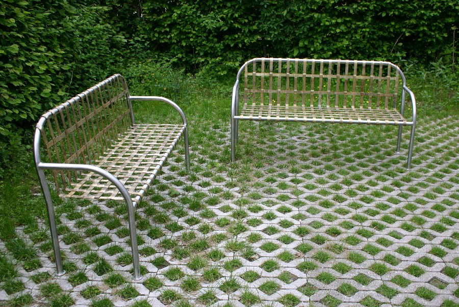 Gartenbank mit einem Gestell aus Edelstahl und einer geflochtenen Messingsitzfläche.