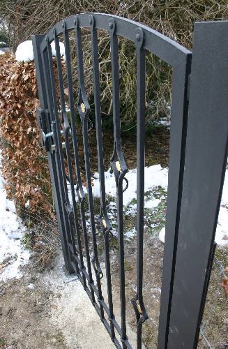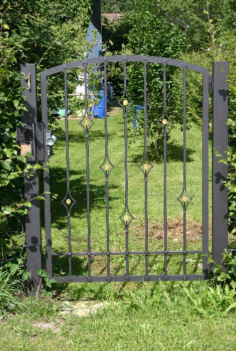 Geschmiedetes Gartentürchen, feuerverzinkt, lackiert und blattvergoldet. Die noch vorhandene Sprechanlage wurde wieder verwendet und mit einem elektrischen Türöffner integriert.
