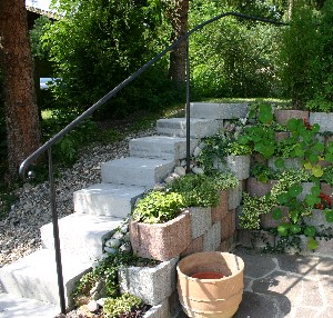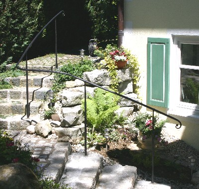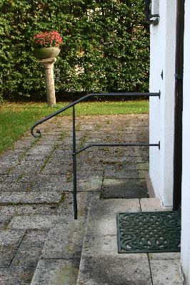 Geschmiedete Rundstahlhandläufe in Gärten und an einem Hauseingang. Alle Handläufe sind feuerverzinkt und lackiert.