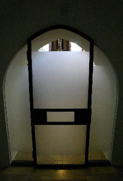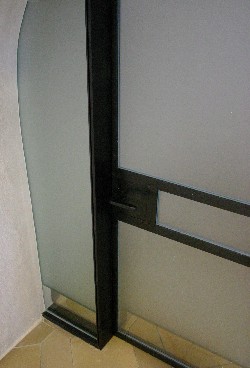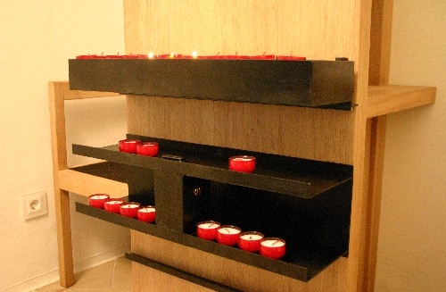 Stahl-Glaselement als Eingang zum Beichtraum und Kerzenleuchter mit Opferstock. Alle Oberflächen Stahl schwarz und gewachst.