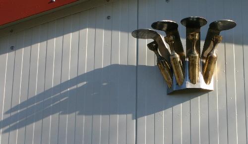 Der Trafo für die 12 Volt Versorgung befindet sich im Innenbereich. Die Reflektoren sind aus poliertem geschmiedetem Edelstahl, die Lampenkörper aus geschmiedetem Messingrohr.