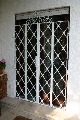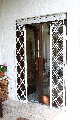 Türgitter, welches zum Öffnen gefaltet wird, da seitlich des Einganges sehr wenig Platz ist. Ausführung in Stahl, grundiert und lackiert, der Aufsatz ist handgeschmiedet.